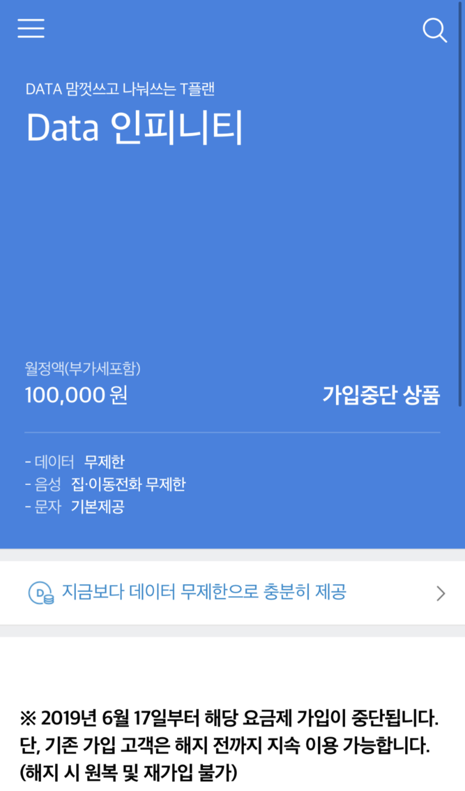 DATA 인피니티 요금제이다. 이 요금제는 10만 원으로 비싸지만 데이터를 마음껏 쓸 수 있는 무제한 상품이다. 하지만 2019년 6월 17일 부터 새로운 가입은 중단되고, 기존 가입 고객만 해지 전까지 이용할 수 있다고 안내해주고 있다. T 시그니처 Classic과 같은 날짜의 같은 조치이다. 다시 106개의 요금제 속에서 이를 찾아볼 수도 있겠지만 포기했다. 있더라도 새로운 요금제인 5G 요금제에서나 스마트워치 무료 요금이 포함되어 있지 안을까 하는 생각에서이다. 일단 현재 쓰고 있는 요금제를 바꾸지 않는 이상 계속 혜택을 받을 수 있으니 유지하고자 하는 것이 현 시점의 결론이다.