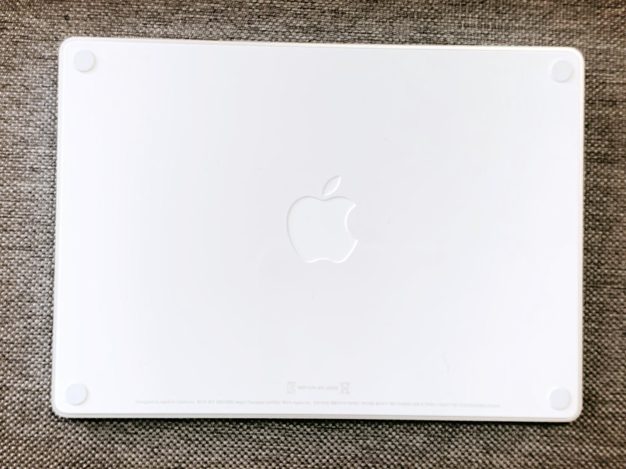 바닥부는 사용하면서 볼일은 없지만 그래도 뒤집어 보면 애플스러운 디자인이 보인다. 4방향 코너 부분에는 미끄럼 방지를 위한 패드가 붙어 있고, 가운데는 애플의 로고가 음각으로 새겨져 있다. 매직 마우스의 경우 상단에 로고가 투영되어 있는 방식인데, 애플 로고를 좋아하는 사람들은 아쉬운 포인트 일 수 있다.