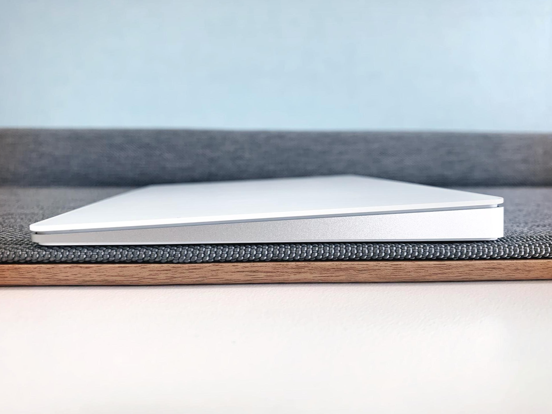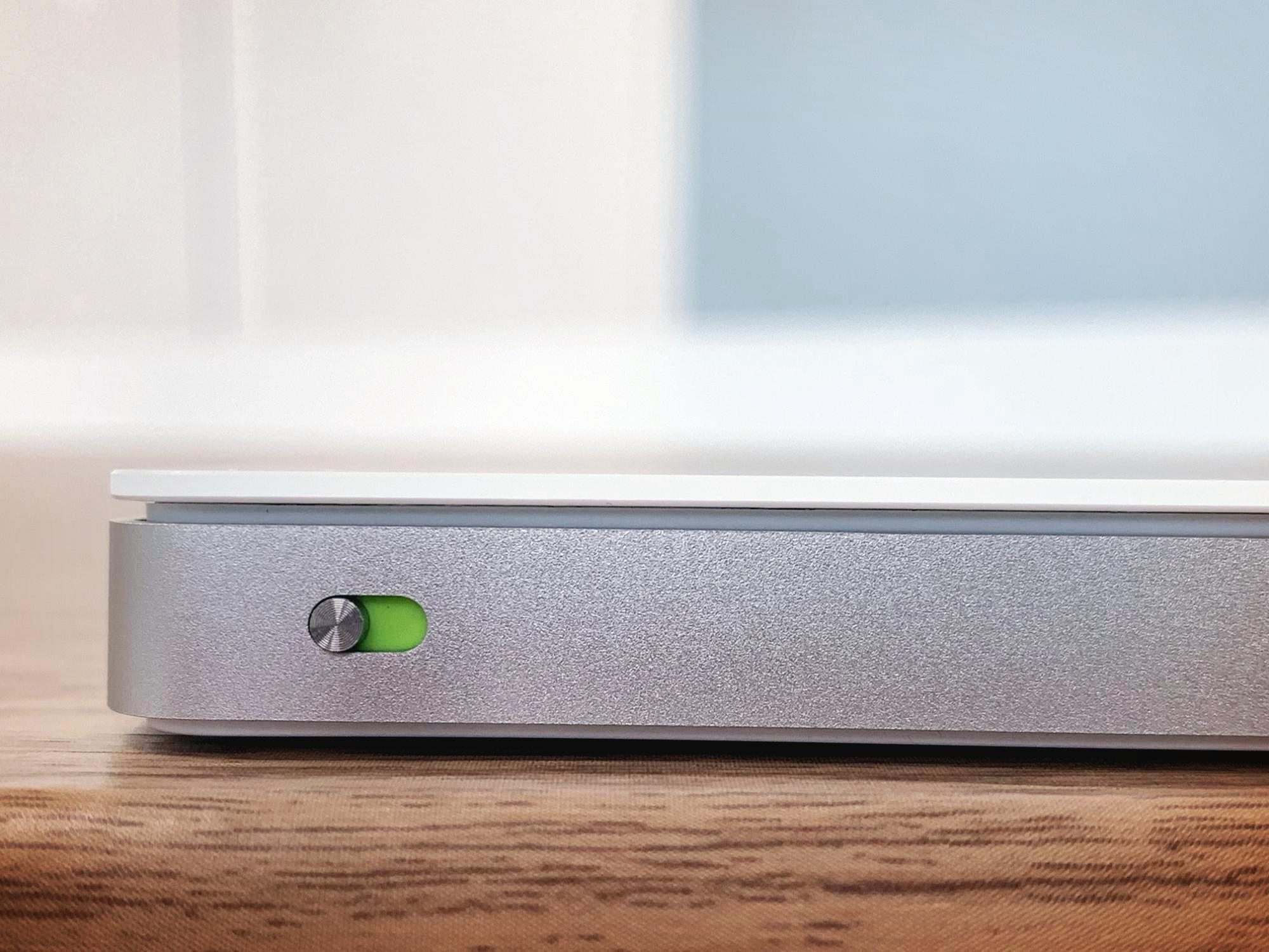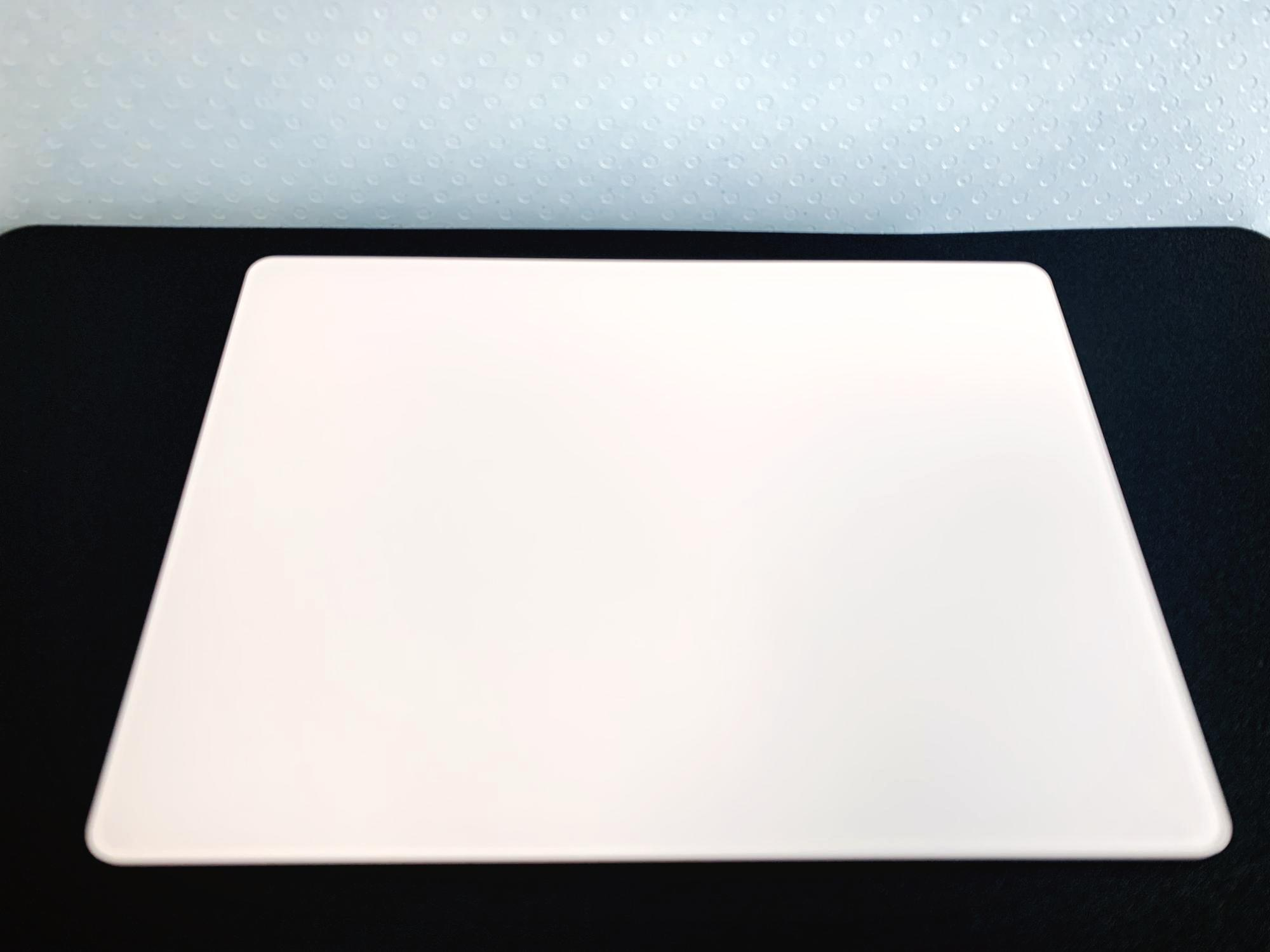 위에서 보면 직사각형 형태의 단순한 모양이지만 옆에서 보면 기울기가 있는 제품이다. 엄연히 상하좌우의 구분이 있으며 상단이 높게 하단이 낮게 설계되어있다. 가로 16cm, 세로 11.49cm의 매직 트랙패드2는 옆으로 긴 방향으로 놓고 낮은 방향을 하래로 맞추면 된다. 상단에는 충전을 위한 라이트닝 케이블 포트가 마련되어 있고, 우측 끝에는 전원의 on/off를 담당하는 레버가 마련되어 있다. 이 레버는 매직 마우스나 매직 키보드와 같은 형태로 손톱지 짧으면 켜고 끄기가 불편할 정도로 작고, 얕다.
