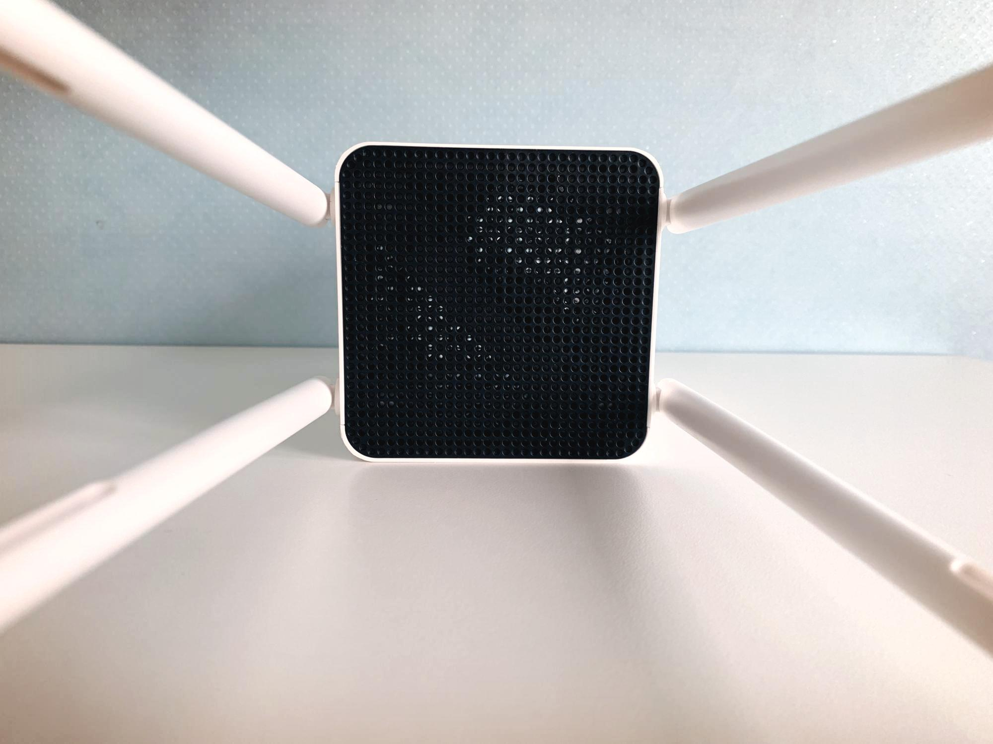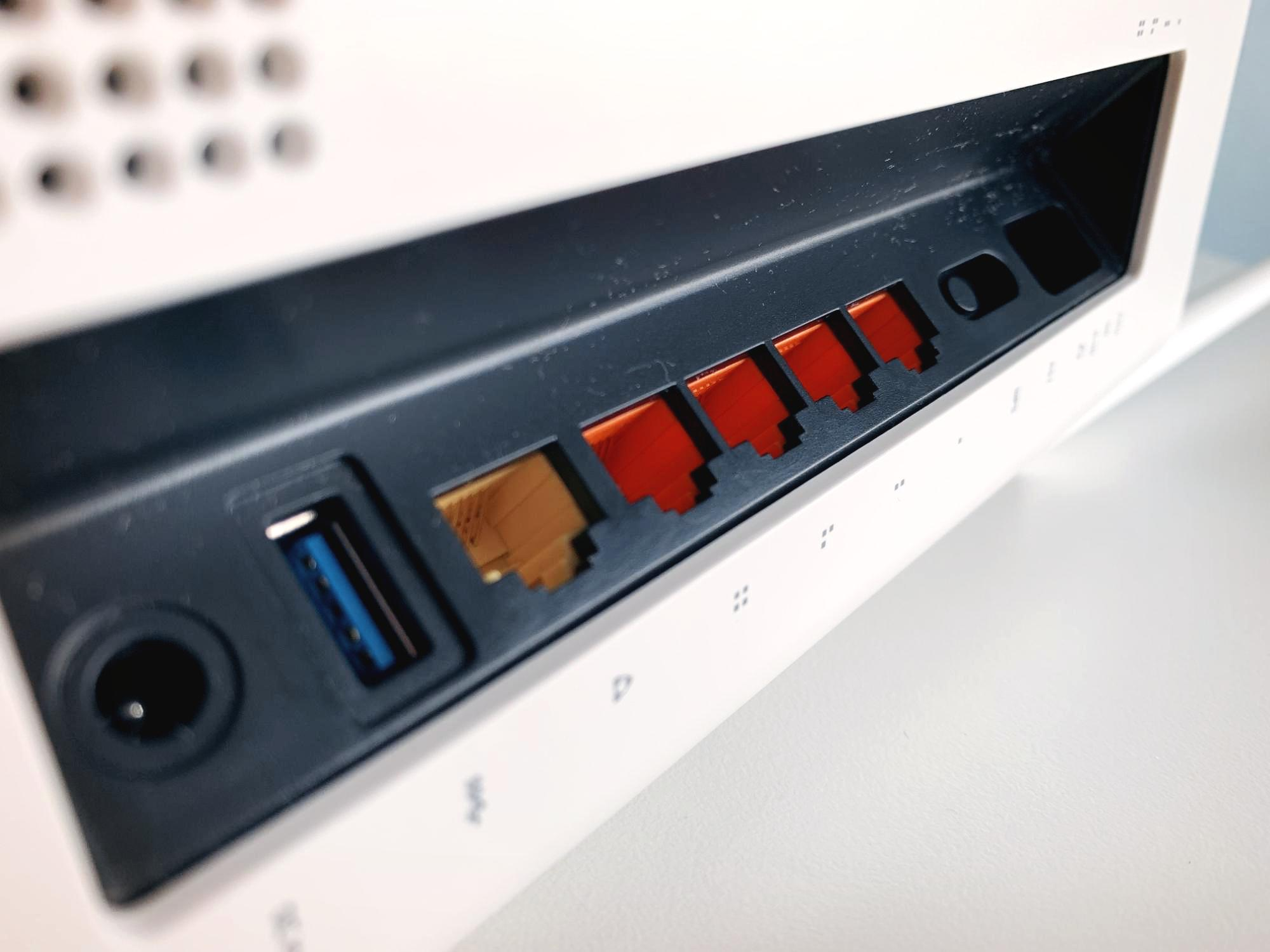 그나마 소개할만한 부분이 있는 후면부이다. 세웠을 때 상단에는 작은 램프가 있으며 전원을 넣고, 인터넷 신호를 받고, 와이파이 연결이 가능한지 여부를 보여주는 아주 작은 붉은색 램프가 자리 잡고 있다. 가장 사용에 있어서 중요한 것은 랜선 5개를 꽂을 수 잇는 포트인데, 하단의 1개는 인터넷 신호가 들어오는 선이고, 상단의 4개는 인터넷 신호가 나가는 선이다. 두 가지의 포트는 색상으로 구분되어 있으니 쉽게 알아볼 수 있다. 그리고 가장 하단의 전원 연결포트와 인터넷 신호가 들어오는 포트 중간에 USB 타입 A 포트가 하나 마련되어 있다. 이 포트는 데이터를 전송하는 용도가 아닌 무선 충전을 위해 전원을 공급하는 포트로 나름 유용하게 사용할 수 있는 장점이 있다.