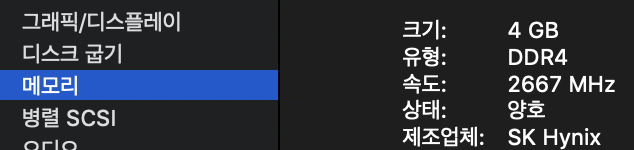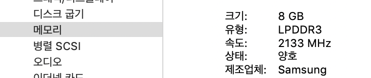 생각난김에 다른 PC도 확인해 보았다. 2018년에 구입한 맥북프로 13인치 모델이다. 역시 같은 방식으로 접근하여 메모리 제조사를 알아보았고, 결과는 아래와 같다.