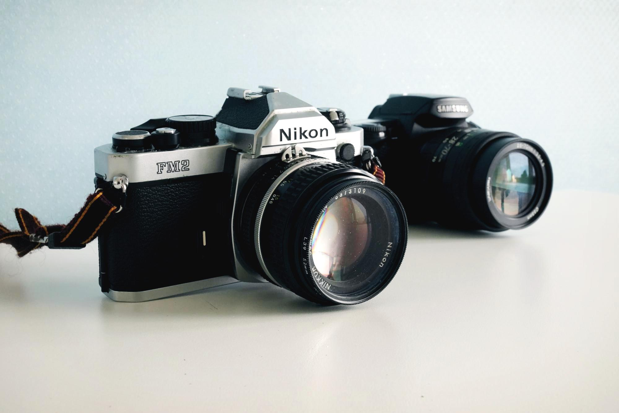 다음은 일본 브랜드 니콘의 FM2를 살펴보도록 하겠다. 첫 인상에서 FM2는 클래식한 카메라의 느낌을 받을 수 있다. 전체적으로 검은색으로 디자인 되었던 GX-1과는 달리 조금은 장난감 같은 느낌도 난다. 하지만 들어보면 장난감 같다는 생각은 사라진다. 무게가 상당하기 때문이다. 이는 금속재질로 만들어진 바디와 내부 장치들로 인해 당시에 SLR은 당연히 받아들여야 하는 무게쯤으로 생각되고는 했다. 하지만 그만큼 튼튼한 인상을 주며, 실제로 튼튼하다.