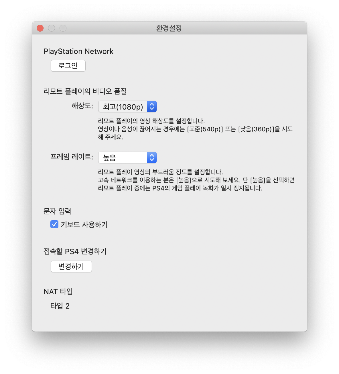 다음은 아이맥에서 준비해야 하는 것들이다. 우선 플레이스테이션4를 구동시킬 프로그램을 다운 받아야 한다. 이 프로그램의 이름은 PS4 리모트 플레이 이다. 소니 플레이스테이션 홈페이지에서 다운로드 받을 수 있으며, 아이맥에 설치하기 위해서는 MAC OS용을 다운로드 받아야하니 이를 받아 설치해 두도록 하자. 그리고 이 프로그램을 구동시키면 아래와 같은 화면이 나오는데 간단한 세팅이 필요하다.