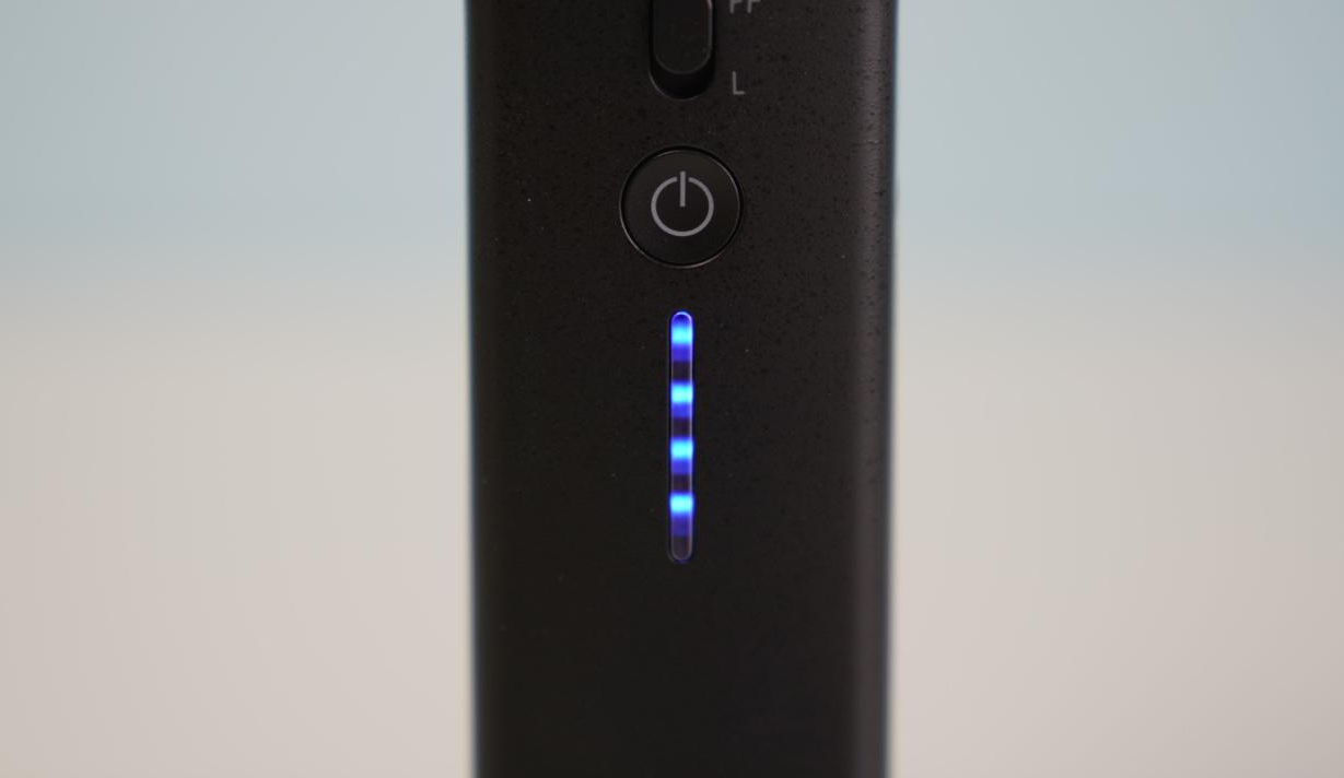 마지막은 하단의 전원 및 그립부이다. 이 부분에는 배터리가 내장되어 있으며, 3발 거치대를 연결하는 홈도 아랫쪽에 나있다. 우선 전원버튼을 살펴보도록 하자. 전원 버튼은 움푹 패여있으며 이 부분을 3초 동안 누르고 있으면, 전원을 켜거나 끌 수 있다. 전원이 켜지게 되면 상단의 스마트폰 거치대 부분이 돌아가면서 켜져있다는 것을 알려주기도 하지만 그립부의 배터리 잔량 표시에 파란불이 들어오면서 전원의 켜짐을 알 수 있기도 하다. 이 부분은 주로 한 손으로 잡고 촬영이 가능하게 설계되어 있으며, 오른손잡이에 맞게 버튼이 배치되어 있다는 것을 다이얼의 위치로 알 수 있다. 하단 홈에 나있는 3발 거치대를 연결하고도 촬영이 가능하지만 스마트폰, 스무스4 본체, 3발 거치대의 무게가 더해지면 들고 있기 힘드니 하나라도 빼서 가볍게 하는 것을 추천한다.
